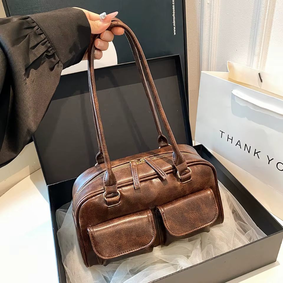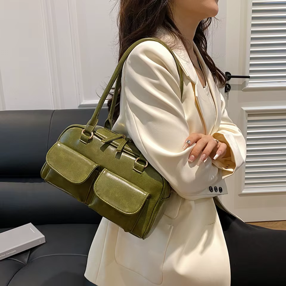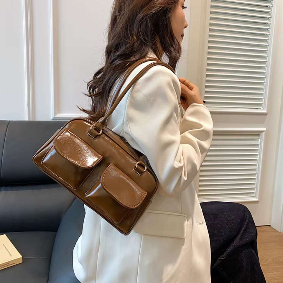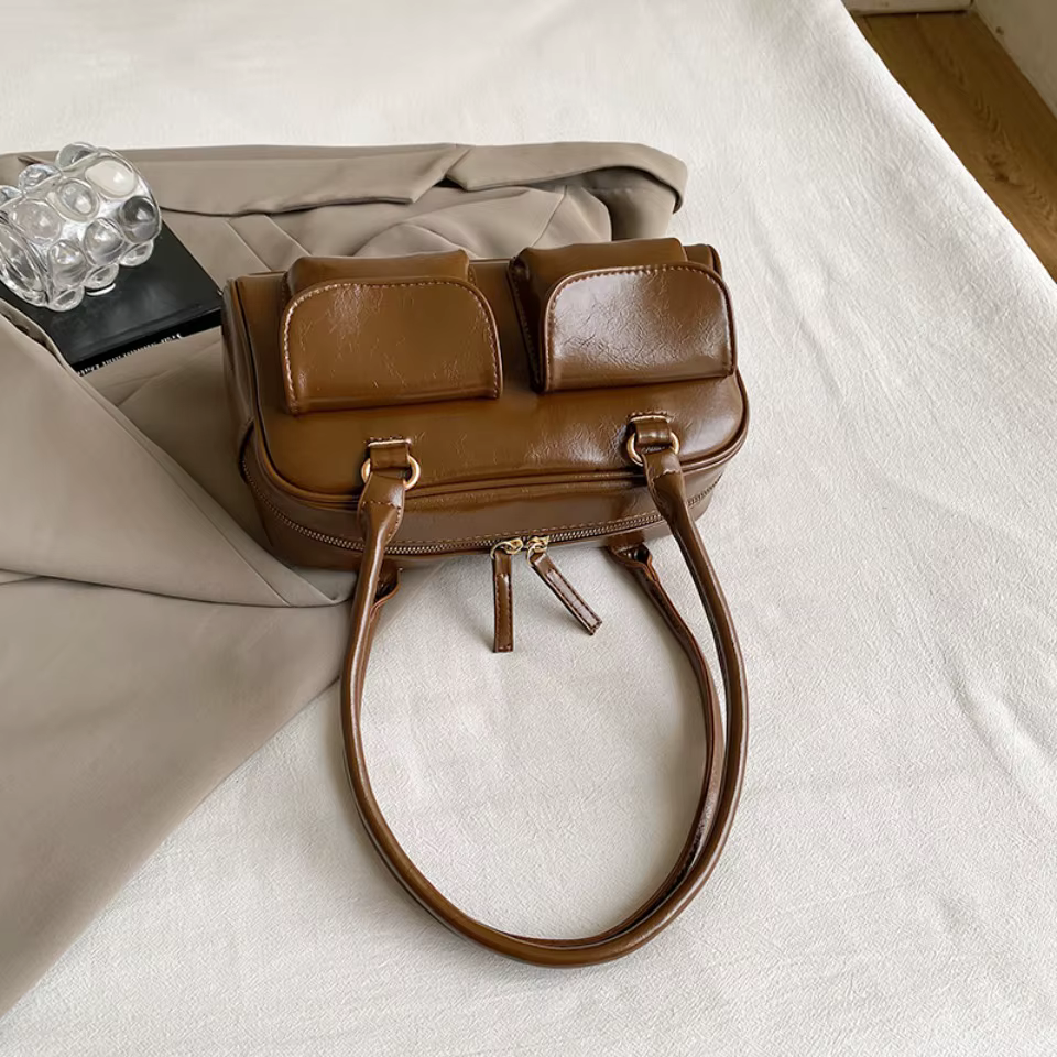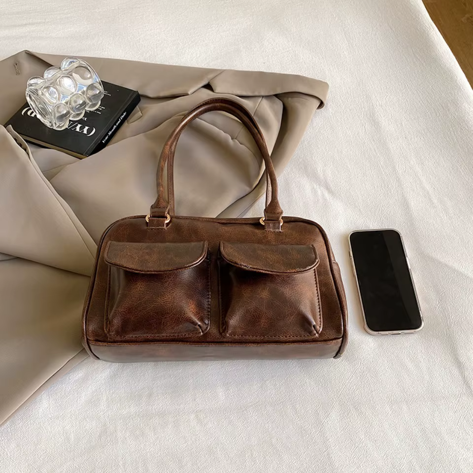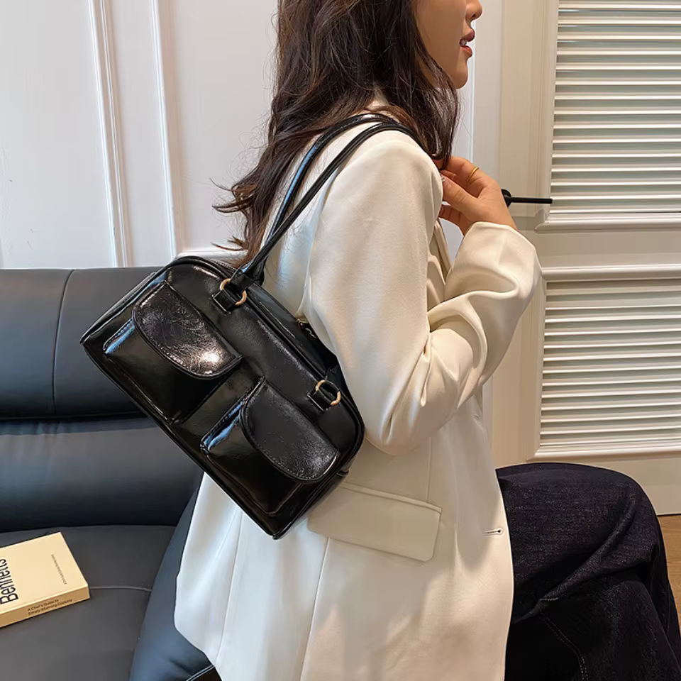 Vintage Women Business Shoulder Bags Simple Ladies Commute Tote Bag Pu Leather 2 Pocket Chic Female Underarm Hand Bag Handbags